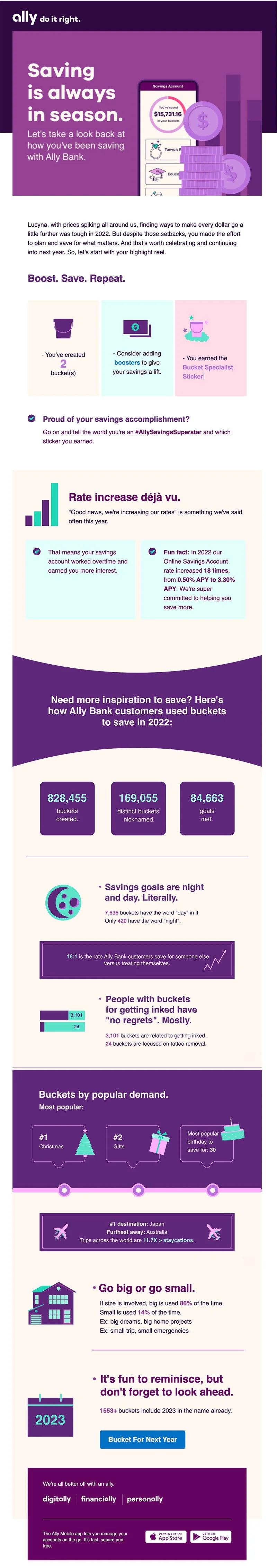 It seems like every brand is jumping on the year-in-review bandwagon 🥱 after Spotify Wrapped’s success, but this email from Ally Bank makes it fun by including stats from their collective users. Did you know: Japan was the #1 travel destination users saved up for in 2022? Proof that an email doesn’t have to be flashy to stand out.